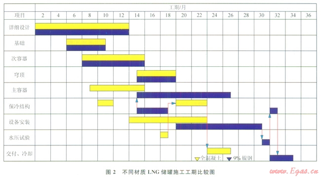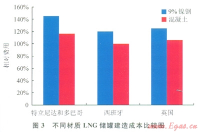 全混凝土罐的應用有很多優(yōu)點。首先,從材料角度講,國內(nèi)的9%鎳鋼材市場緊張,且9%鎳鋼雖已初步實現(xiàn)國產(chǎn)化,但價格依然昂貴。與之相比,混凝土材料容易獲得,成本較低。其次,全混凝土罐的平行施工工序多,建造工期短(2),因工期產(chǎn)生的費用相對較低(3)。從圖2可以看出,全混凝土內(nèi)罐與外罐的平行施工搭接時間長,保冷結(jié)構(gòu)安裝與設(shè)備安裝可同時進;對于9%鎳鋼,外罐施工即將結(jié)束時才能進行內(nèi)罐施工,保冷結(jié)構(gòu)安裝與設(shè)備安裝不存在搭接時。常規(guī)的16×104m3儲罐工期約為33個月,而全混凝土罐的建造工期約為25個月,可節(jié)省工期8個月。工期縮短可使LNG儲罐提前投產(chǎn),也接減小了LNG儲罐建造費用。從圖3可以看出,采用全混凝土LNG儲罐至少可節(jié)約20%的建造成本[3]。最后,全混凝土LNG罐可以擴大業(yè)主對承包商與設(shè)計單位的選擇范圍,優(yōu)化LNG儲罐的設(shè)計與建造市場。同時混凝土的應用在全球經(jīng)驗都較為成熟,人們對混凝土低溫特性的認識也逐漸走向成熟[4]