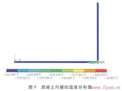 在正常運行條件下,LNG蒸發(fā)氣與LNG共存,LNG儲罐的環(huán)境溫度在-162℃附近,由ANSYS模擬可確定,對于0.8m厚的罐壁,穩(wěn)定后內(nèi)罐外表面的溫度在-159℃附近。內(nèi)罐整體被凍透,所以不考慮凍融的影響。內(nèi)罐底板與罐壁的溫度分布如圖5示。