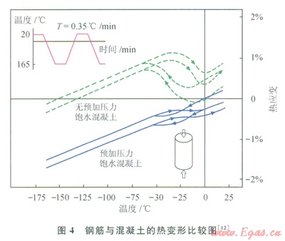 在檢修、維護的情況下,混凝土內(nèi)罐的局部溫度會有所升高,混凝土會受到凍融循環(huán)的影響。凍融循環(huán)試驗表明[8]:在凍融循環(huán)的情況下,鋼筋與混凝土的黏結(jié)強度、混凝土的強度隨凍融循環(huán)次數(shù)的增加而降低,且高含水量的混凝土受影響較大,減小混凝土中的含水量是降低凍融循環(huán)損害的有效途徑。圖4為鋼筋與混凝土的熱變形比較圖。從圖4以看出,在預加壓力下,混凝土與鋼筋的熱膨脹系數(shù)接近,且呈線性變化,所以對混凝土施加預應力,可有效提高鋼筋與混凝土的黏結(jié)性能,提高混凝土耐久性[12];快速有效的檢修、維護方案、管理制度也是降低凍融損害的有效辦法。