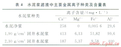 使用原子吸收分光光度計(jì)測定水泥漿濾液中金屬離子種類及含量,結(jié)果見表4,水泥濾液中金屬離子主要有Ca2+、Fe3+Ma2+、Al3+。