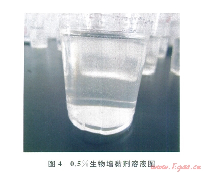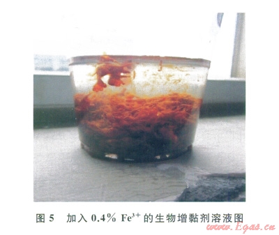 配制0.5%生物增黏劑溶液(4),分別在其中加0.1%、0.2%、0.3%、0.4%、0.5%的FeCl3、CaCl2、AlC13、MgCl3,結(jié)果如下:加入Al3+后,溶液迅速生成大量半透明白色獨(dú)立的小粒徑球狀凝膠,里面包裹了大量的水,隨著加量增大,凝膠量不斷增多,直到加量0.4%后不再變化;加入Fe3+后,溶液迅速生成大量棕黃色獨(dú)立的小粒徑球狀凝膠,里面包裹了大量的水,隨著加量增大,凝膠體積不斷增大,直到加量0.4%后不再變化(5);加入Mg2+Ca2+后溶液無明顯變化。