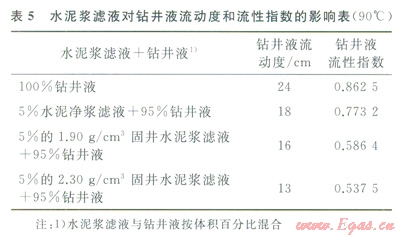 3種水泥漿濾液加入到鉆井液后,鉆井液的流動(dòng)度與流性指數(shù)見表5。