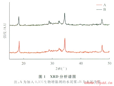 水泥凈漿與加入0.3%生物增黏劑的水泥漿的XRD圖譜如圖1。由圖1可知水泥中物相主要有Ca(OH)2、C3S、C3A、C3AF等。加生物增黏劑后Ca(OH)2的特征峰(2q18°、34°47°、52°左右)強(qiáng)度下降,可能是加生物增黏劑水泥水化過程延緩。除Ca(OH)2的特征峰外,其他各物相結(jié)構(gòu)特征峰的強(qiáng)度無明顯變化,并且所有物相結(jié)構(gòu)的特征峰均一致重合,說明摻生物增黏劑水泥漿沒有新物相生成。