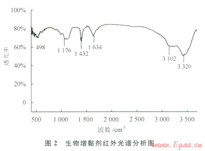 生物增黏劑的紅外光譜分析圖見圖2。由圖2可知其主要有羥基、羧基、醛酮基、酯基等。其b主鏈上含有D-葡萄糖、D-甘露糖、D-葡萄糖醛酸。每8個(gè)殘?zhí)腔?/span>D-葡萄糖醛酸有一個(gè)甘露糖支鏈。每16個(gè)殘?zhí)腔赡苡?/span>1個(gè)1-羧基-亞乙基D葡萄糖。
