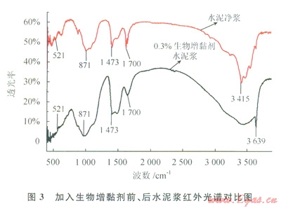 水泥凈漿與加入0.3%生物增黏劑的水泥漿的紅外光譜圖如圖3所示。由圖3可知,與水泥凈漿相比,加入0.3%生物增黏劑后水泥石中C3S的特征峰強(qiáng)度(871cm-1,521.04cm-1440.55cm-1)有所增加,可能是生物增黏劑在一定程度上抑制了C3S的水化。