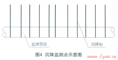 整個管道全長132.1m,共設11個沉降監(jiān)測點,按照均勻布置原則,并考慮現(xiàn)場實際情況,沉降監(jiān)測點之的間隔為15m左右。如圖4所示。