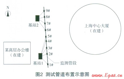 監(jiān)測管段位于上海中心大廈與另一座正在施工的建筑之間,屬于地面沉降危險地段,為防止天然氣管道在建筑施工期發(fā)生破壞,決定進行天然氣管道的更換,9根試驗管段也作為更新管道的一部分接入整個管線,監(jiān)測管道以及周同主要建筑物的相對位置如2所示。