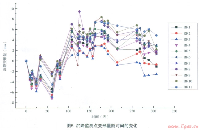 整個實驗系統(tǒng)安裝完畢后即開始運行,截至目前的300天時內(nèi),沉降數(shù)據(jù)的采集頻率由人工操作,大約為201次,各沉降監(jiān)測點的監(jiān)測結(jié)果如圖5。