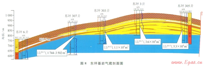 在流體識(shí)別、儲(chǔ)層參數(shù)計(jì)算、有效厚度確定的基礎(chǔ)上,通過(guò)多井對(duì)比,對(duì)氣藏有如下認(rèn)識(shí):基巖氣藏為雙重孔隙結(jié)構(gòu),氣藏內(nèi)部受裂縫發(fā)育,后期巖脈侵入等影響,縱向及平面上均表現(xiàn)出一定的非均質(zhì)性,北部的3井區(qū)和南部的l井區(qū)基巖段均為底水塊狀氣藏,基巖氣藏上部和側(cè)向與斷層下盤(pán)對(duì)接的地層為E1+2致密泥巖層及膏巖層,對(duì)厚層基巖氣藏起到了很好的封堵作用(8)。