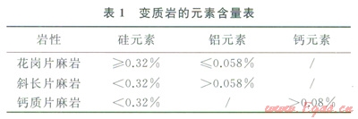 在巖心歸位的基礎(chǔ)上,利用不同巖性的數(shù)據(jù)點(diǎn)繪制中子密度交會(huì)圖,花崗片麻巖的樣本點(diǎn)落在砂巖線上或其上方,斜長(zhǎng)片麻巖的樣本點(diǎn)在白云巖線上,鈣質(zhì)片麻巖的樣本點(diǎn)在石灰?guī)r線和白云巖線之。元素俘獲譜測(cè)井可以得到地層中主要的元素含量,可用于化學(xué)成分不同的變質(zhì)巖的區(qū)分[6]?;◢徠閹r的石英長(zhǎng)石含量高,暗色礦物含量低,因此元素俘獲譜上硅元素含量高,而鋁元素含量低;鈣質(zhì)片麻巖含有較多的碳酸鹽礦物,因此元素俘獲譜上鈣元素含量高、硅元素含量低;斜長(zhǎng)片麻巖含有較多的角閃石等暗色礦物,因此元素俘獲譜上硅元素含量相對(duì)低而鋁元素含量相對(duì)高,不同巖性的元素含量如表1所示。