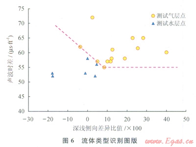 采用深、淺側(cè)向的差異同深電阻率的比值與聲波的交會(huì)圖來(lái)確定流體性質(zhì)(6)。從圖6中看出氣層點(diǎn)都位于右上方,而水層點(diǎn)位于左下方,從測(cè)井的原理看含氣好的層段深淺側(cè)向有較大的正差異特征或者小的負(fù)差異,而水層由于淡水鉆井液的侵入會(huì)使得電阻率出現(xiàn)負(fù)差異,當(dāng)然裂縫的發(fā)育情況及產(chǎn)狀對(duì)電阻率的影響比較大,但從解釋結(jié)果看都是以網(wǎng)狀裂縫為主。因此認(rèn)為電阻率的差異與流體類(lèi)型存在一定的聯(lián)系。