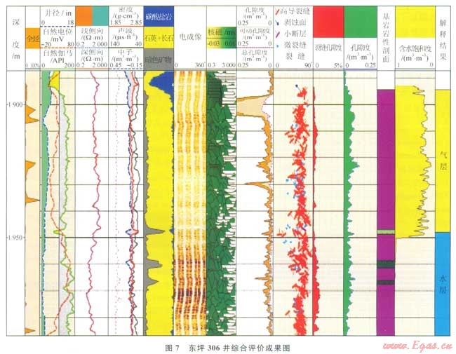 氣層與干層的確定是以隙度大大小進(jìn)行劃分的。核磁資料表明當(dāng)孔隙度為2%時(shí),可動(dòng)流體只有1%,同時(shí)參考了國(guó)內(nèi)外眾多的古潛山油氣藏,以隙度2%作為有效儲(chǔ)層的下限。據(jù)前述方法對(duì)區(qū)塊內(nèi)的井進(jìn)行了綜合評(píng)價(jià),如圖7所示為東坪306井的評(píng)價(jià)成果圖。該井1894.5m以下為花崗巖,電成像表明高導(dǎo)裂縫非常發(fā)育,裂縫孔隙度分布在0.05%~0.5%之間,總孔隙度為6.2%,計(jì)算的含氣飽和度為70%,深、淺側(cè)向有小的正差異氣測(cè)錄井顯示較好(中部因取心氣測(cè)低),解釋為氣層;下部巖性、物性與上部相當(dāng),但電阻率明顯降低,且深、淺側(cè)向基本重合,氣測(cè)無(wú)示,解釋為水層,據(jù)此確定了氣水界面。其數(shù)據(jù)為:1894.51950.0m,電阻率20100W·m,核磁動(dòng)孔隙度3.2%,溶蝕孔隙度6.2%,裂縫走向NWSE,裂縫孔隙度0.02%~0.50%,含氣飽和度70%,釋為氣層;井段1950.02097.3m,電阻率480W·m,核磁可動(dòng)孔隙度1.5%,溶蝕孔隙度4.0%,縫走向NWSE,裂縫孔隙度0.05%~0.80%,含氣飽和度為0,解釋為水層。