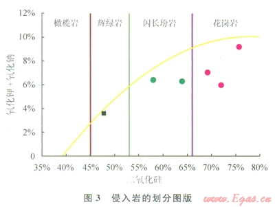 儲(chǔ)層巖性識(shí)別是油氣藏評(píng)價(jià)的前提和基礎(chǔ)工作,與常見(jiàn)的沉積巖不同的是基巖巖性復(fù)雜多變,測(cè)井識(shí)別困難。地面露頭踏勘和鉆井巖心分析表明東坪氣田的基巖包括火成巖和變質(zhì)巖兩大類(lèi)巖性(1),北部3井區(qū)基巖以侵入巖為主,南部1井區(qū)以變質(zhì)巖為主。研究表明侵入巖主要為花崗巖,中夾有輝綠巖、閃長(zhǎng)玢巖的巖脈。變質(zhì)巖可分為3大類(lèi),分別為花崗片麻巖、斜長(zhǎng)片麻巖和鈣質(zhì)片麻巖。侵入巖和變質(zhì)巖的區(qū)分可利用鉀和自然伽馬的交會(huì)圖(2)。由于侵入巖以鉀長(zhǎng)石含量較高的花崗巖為主,其鉀含量和自然伽馬為相對(duì)高值,變質(zhì)巖的鉀和自然伽馬相對(duì)低值。因此侵入巖位于交會(huì)圖的右上角而變質(zhì)巖位于交會(huì)圖的左下方。利用元素俘獲譜資料實(shí)現(xiàn)兩大類(lèi)巖性的細(xì)分。二氧化硅與氧化鈉和氧化鉀之和的交會(huì)圖(3)實(shí)現(xiàn)侵入巖的細(xì)分,花崗巖的二氧化硅含量高,為66%,輝綠巖為45%~53%,閃長(zhǎng)玢巖為53%~66%。據(jù)此實(shí)現(xiàn)了北部3井區(qū)基巖儲(chǔ)層巖性的識(shí)別與劃分。變質(zhì)巖的種類(lèi)繁多且其成因復(fù)雜,因而變質(zhì)巖的識(shí)別與劃分相對(duì)侵入巖要復(fù)雜得多。通常認(rèn)為在變質(zhì)巖的形成過(guò)程中化學(xué)成分穩(wěn)定,這為利用元素俘獲譜測(cè)井劃分巖性提供了有利條件,同時(shí)由于礦物成分的不同其密度與中子值也有所不同。因此常規(guī)曲線對(duì)巖性的劃分也提供了好的資料。
