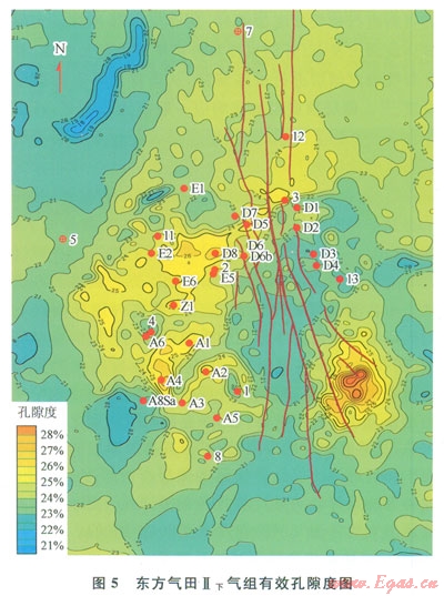 在進(jìn)行儲(chǔ)層孔隙度橫向描述之前,需要進(jìn)行了大量的儲(chǔ)層物性研究工作。研究的目的是通過(guò)分析儲(chǔ)層物性和與地震資料有直接關(guān)系的儲(chǔ)層的速度、密度和波阻抗等地震屬性的相關(guān)關(guān)系,來(lái)建立起合理的井震關(guān)系[14]。中海石油(中國(guó))有限公司湛江分公司西部東方氣田各氣組單井孔隙度與地震的波阻抗、速度和密度都有一定的相關(guān)性。圖4為東方氣田多井分氣組進(jìn)行的孔隙度與地震的波阻抗、速度和密度的相關(guān)分析結(jié)果,從圖4上可以看出各氣組儲(chǔ)層的孔隙度與這幾種地震屬性有較好的相關(guān)關(guān)系,其中Ⅱ上氣組孔隙度和波阻抗的相關(guān)關(guān)系高達(dá)0.82,這說(shuō)明東方氣田儲(chǔ)層的孔隙度與地震屬性有較好的相關(guān)性。因此,可以利用與地震屬性的相關(guān)性預(yù)測(cè)儲(chǔ)層孔隙度的方法來(lái)描述孔隙度的橫向變化。通過(guò)抽井檢驗(yàn)和儲(chǔ)量對(duì)比等方式檢查認(rèn)為各個(gè)氣組的孔隙度預(yù)測(cè)結(jié)果均為合理結(jié)果(圖5)。