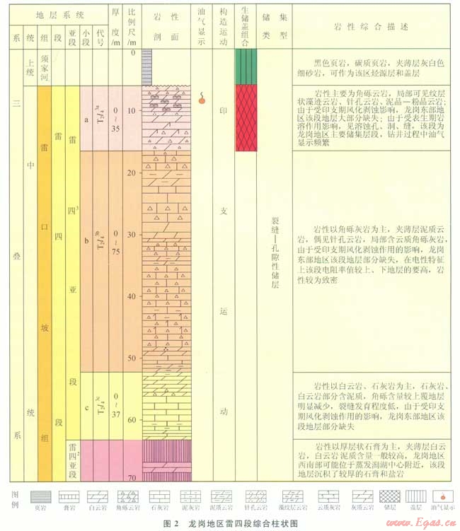中三疊世四川盆地沉積的雷口坡組主要為碳酸鹽巖夾膏巖、鹽巖,偶夾泥質(zhì)巖,橫向分布較為穩(wěn)定。底部為區(qū)域標(biāo)準(zhǔn)層的黃綠色水云母黏土巖(俗稱綠豆巖”),厚度薄,但分布廣而穩(wěn)定,與下伏下三疊統(tǒng)嘉陵江組分界;頂部以泥粉晶云巖、角礫云巖與上覆上三疊統(tǒng)須家河組陸相碎屑巖明顯分界,呈假整合接觸。根據(jù)四川盆地和鄂西、黔北地區(qū)中三疊統(tǒng)區(qū)域地層劃分方案,雷坡組分為4段,自下而上分別為雷一段、雷二段、雷三段和雷四段[5]。
