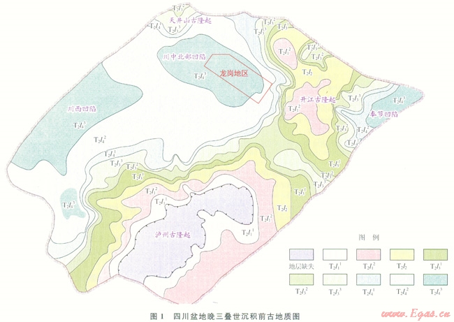 中三疊世末,伴隨著印支運(yùn)動(dòng)的發(fā)生,地臺(tái)整體抬升形成大規(guī)模的海退,上揚(yáng)子地臺(tái)由此結(jié)束了以海相沉積為主的歷史,進(jìn)入以陸相沉積為主的時(shí)期,地層遭受剝蝕。在此過程巾形成了隆起與凹陷,盆地內(nèi)展現(xiàn)為三隆三凹的格局(1)。三隆指南側(cè)瀘州古隆起、北側(cè)開江古隆起以及北西邊緣廣元江油附近的天井山古隆起,三凹是指川西凹陷(包括德陽成都大邑邛崍眉山雅安地區(qū)和樂山犍為地區(qū))、川中北部凹陷(包括蒼溪閬中儀隴地區(qū))和川東北的奉節(jié)凹陷。隆起中心地層遭受剝蝕程度大,瀘州古隆起頂部雷口坡組剝蝕殆盡,開江占隆起殘存雷一段,在凹陷內(nèi)剝蝕程度相對(duì)較弱,均保留了雷四段。