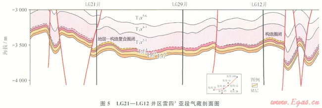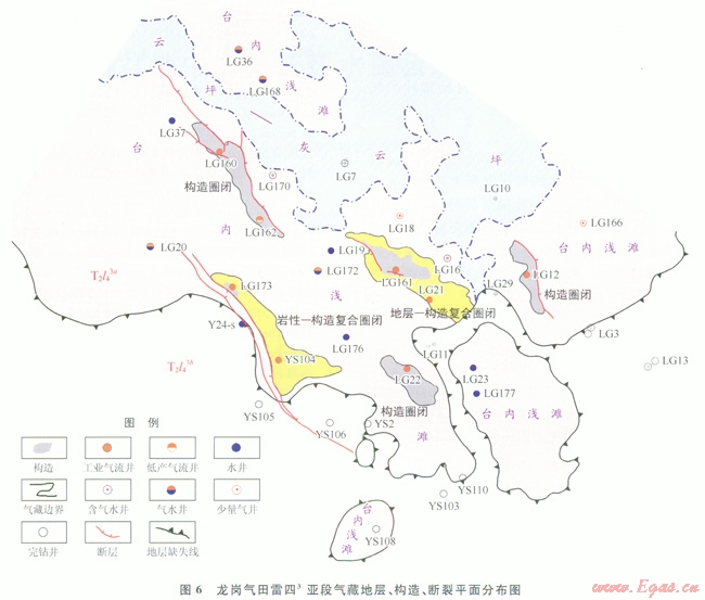 四川盆地雷口坡組大多數(shù)氣藏圈閉類型為構(gòu)造圈閉,根據(jù)雷四3亞段a小段地層、沉積微相、儲(chǔ)層對(duì)比分析、巖心物性分析和測(cè)井綜合解釋成果、綜合鉆井測(cè)試、氣水分布特征、地震儲(chǔ)層預(yù)測(cè)成果和構(gòu)造分析,認(rèn)為雷四3亞段氣藏圈閉類型較為復(fù)雜,在大型地層尖滅的背景上,受構(gòu)造、斷層和巖性變化影響,發(fā)育地層  構(gòu)造、巖性  構(gòu)造、構(gòu)造等多種圈閉類型(5、6)。