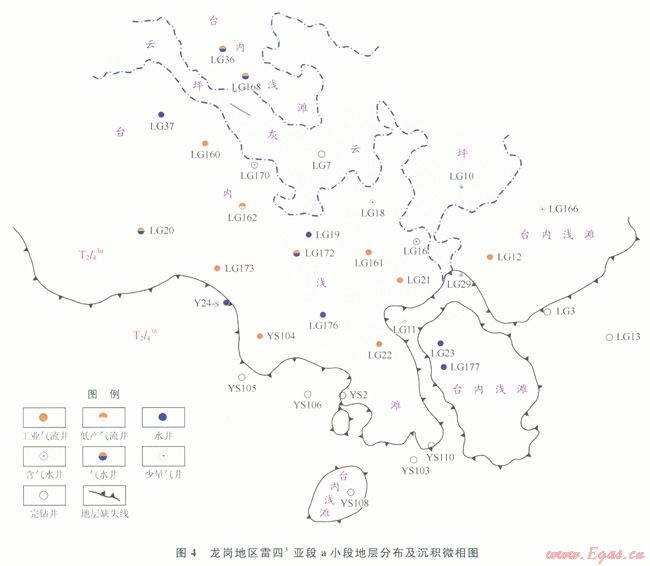 3)在大型地層尖滅的背景上,受構(gòu)造、斷層和巖性變化影響,發(fā)育地層  構(gòu)造、巖性一構(gòu)造等多種圈閉類型。雷四3亞段a小段尖滅帶附近的次級(jí)巖溶斜坡是尋找工業(yè)氣井的最有利區(qū)。