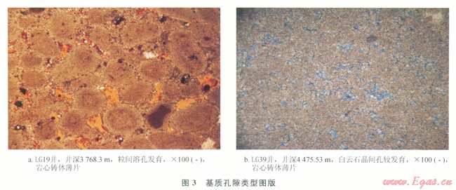 儲(chǔ)層基質(zhì)孔隙類型有粒溶孔、晶溶孔、粒內(nèi)溶孔、鑄??缀腕w腔孔,其中粒溶孔、晶溶孔是主要的孔隙類型,其發(fā)育程度直接影響到儲(chǔ)層的儲(chǔ)集能力。