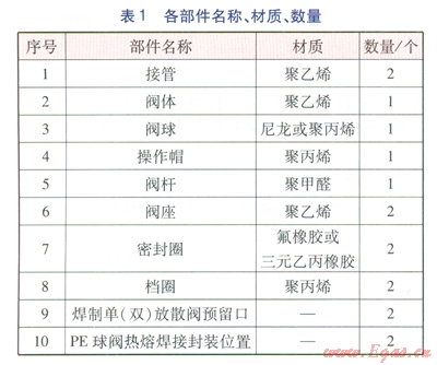 PE球閥的基本結(jié)構(gòu)見圖1,各部件名稱、材質(zhì)、數(shù)量見表l。