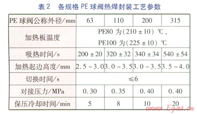 熱熔焊接封裝指閥體與兩端接管的熱熔焊接,見圖l中位置10。PE球閥的熱熔焊接封裝采用熱熔焊機(jī)進(jìn)行,從而形成不可分離的整體,各規(guī)格PE球閥熱焊封裝工藝參數(shù)見表2。