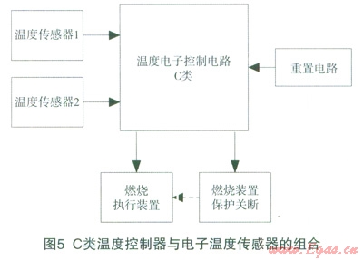 如圖5,這種設(shè)計沒有一個最后的獨立保護裝置,安全依賴于系統(tǒng)安全完整性(參考文獻[2])的要求保證。其中一個溫度傳感器設(shè)在燃燒器(或熱交換器),另一個在輸出熱水端。當其中一路溫度傳感器或其檢測電路失效,另一路可以被監(jiān)測并保護。由于采用全電子控制器來實現(xiàn)溫度控制功能,該電子控制器必須按照C類電子控制器的要求來設(shè)計,軟件也必須符合C類軟件要求,這樣使整體符合C類安全要求。
