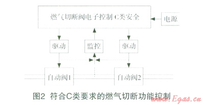 第二,兩個閥門同時由符合C類安全的電子控制器控制,整體可以達到C安全要求,如圖2。當自動閥1失效,如果電子控制器符合C類安全,自動閥2在任意兩個故障的條件下均可以保證處于安全狀態(tài),所以整體符合C類安全要求。按照這種分析,自動閥1、2是可以同時驅(qū)動的(并聯(lián))。所以閥的冗余與閥驅(qū)動的冗余是安全設(shè)計兩個方面,都必須要做到。
