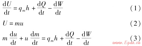 容積模型是一個(gè)開式系統(tǒng)模型,根據(jù)熱力學(xué)第一定律計(jì)算容積內(nèi)溫度、壓力和氣體質(zhì)量的變化[5]。此模型應(yīng)用于調(diào)壓器模型的高壓腔、低壓腔和控制腔,模型為: