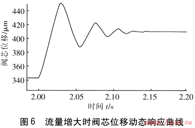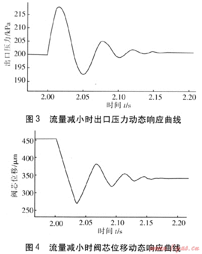 調(diào)壓器在穩(wěn)定狀態(tài)運(yùn)行2.00s時(shí)突然增大閥門開度,流量突然增大,出口壓力和閥芯位移動(dòng)態(tài)響應(yīng)曲線見圖5、6。