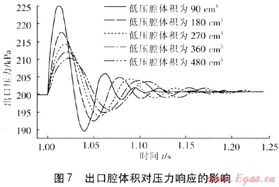 低壓腔體積分別為90、180、270、360和480cm3時(shí),在t=1.00s時(shí)刻突然減小閥門開度,流量突然減小,出口壓力的動(dòng)態(tài)響應(yīng)曲線見圖7??梢钥吹?,在一定范圍內(nèi),隨著低壓腔體積的增加,超調(diào)量逐漸減小,而對(duì)過渡時(shí)間的影響不大。