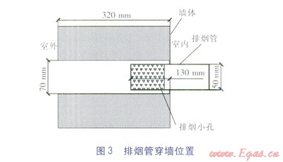 經(jīng)測量,進入穿墻孔的排氣管長度只有130mm,并沒有伸出厚度為320mm的穿墻孔,開有多個小孔的排氣管最外端實際仍處于穿墻洞內(nèi)。涉案熱水器工作時煙氣只能排入穿墻孔洞內(nèi)(詳見圖3)。