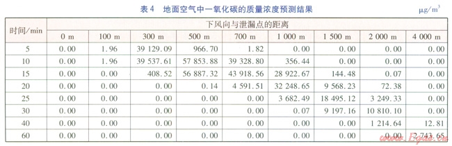 泄漏條件:一氧化碳的泄漏質(zhì)量流量為0.76kg/s,泄漏持續(xù)時間為10min,泄漏點(diǎn)高度為3m,每10s釋放一個煙團(tuán)。氣象條件:風(fēng)速為1.8m/s,大氣穩(wěn)定度為D級。采用多煙團(tuán)模式預(yù)測方式的預(yù)測結(jié)果見表4。根據(jù)預(yù)測結(jié)果,可分析不同時刻下風(fēng)向地面空氣中一氧化碳質(zhì)量濃度超標(biāo)距離范圍。