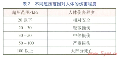 由沖擊波一沖量準(zhǔn)則確定的不同超壓范圍對建筑物的破壞程度、人體的傷害程度分別見表1、2。