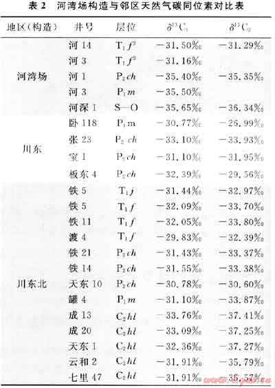 3) 河灣場氣田奧陶系、二疊系地層天然氣δ13C1在-35.65‰~-35.40‰之間,δ13C2在-35.35‰~-36.34‰,乙烷碳同位素明顯低于-34‰,具有典型的腐泥型天然氣特征,與川東和川東北地區(qū)二、三疊系天然氣存在明顯的差別,而與川東北地區(qū)石炭系天然氣乙烷碳同位素大致相當(dāng)。