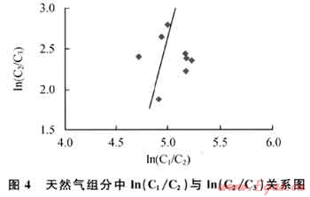 既然河灣場奧陶系、二疊系天然氣與川東石炭系天然氣都來源于志留系烴源巖,為何甲烷碳同位素差異這么大呢?在天然氣生成過程中,存在著2種成因的天然氣,即干酪根裂解氣和原油裂解氣。對于多期成藏的盆地,早期形成的古油藏隨埋深的增大其溫度增高,古油藏中的原油必然要發(fā)生二次裂解而形成天然氣。干酪根裂解和原油裂解形成的天然氣中的C1/C2與C2/C3值完全不同:干酪根裂解所形成的天然氣ln(C1/C2)值變化較大,ln(C2/C3)值變化較?。欢投瘟呀庑纬傻奶烊粴鈒n(C1/C2)值變化較小,ln(C2/C3)值變化范圍較大[4~9]。由圖4可見,河灣場氣田的天然氣具有原油二次裂解氣的特征。此外,川西北部地區(qū)經(jīng)歷了古油氣藏的形成及多期成藏過程,且泥盆系-侏羅系儲(chǔ)層中廣泛分布瀝青也說明該區(qū)存在大量原油裂解氣提供了依據(jù)。