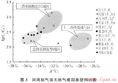 沈平(2005)根據(jù)天然氣乙烷碳同位素特征,將四川盆地海相地層天然氣劃分為3種類型。第一類是δ13C1<-34.0‰,最輕為-37.0‰左右(如福成寨石炭系),川東絕大部分石炭系,尤其是川東北地區(qū)基本屬于這一類。王廷棟等(1994)曾利用儲(chǔ)層瀝青和氣體地球化學(xué)特征綜合判斷為志留系腐泥型烴源巖成因。第二類是δ13C2>-30.0‰,如典型的煤成氣板東4井P22和臥龍河部分下二疊統(tǒng)天然氣,前人研究表明它們主要屬于上二疊統(tǒng)龍?zhí)督M煤系有機(jī)質(zhì)成因(楊遠(yuǎn)聰?shù)龋?989;王廷棟等,1994;鄭永堅(jiān),1995;王蘭生等,1997)。第三類δ13C2介于-34.0‰~-30.0‰,主要分布在川東北二疊系和下三疊統(tǒng)飛仙關(guān)組中,在平面上環(huán)開江-梁平海槽分布或直接分布在開江-梁平海槽中,該類氣體碳同位素組成特征與來源于志留系的腐泥型天然氣和來源于上二疊統(tǒng)龍?zhí)督M煤成氣(腐殖氣)明顯不同。河灣場氣田奧陶系、二疊系地層天然氣δ13C1介于-35.65‰~-35.40‰,δ13C2介于-35.35‰~-36.34‰,乙烷碳同位素明顯低于-34‰,具有典型的腐泥型天然氣特征。與此同時(shí)該區(qū)天然氣乙烷碳同位素與川東和川東北地區(qū)二、三疊系天然氣存在明顯的差別,明顯偏輕。河灣場氣田乙烷碳同位素與川東北地區(qū)石炭系天然氣乙烷碳同位素大致相當(dāng)(表2、圖3)。其相同或者相近的乙烷碳同位素特征預(yù)示它們有著相同的來源。