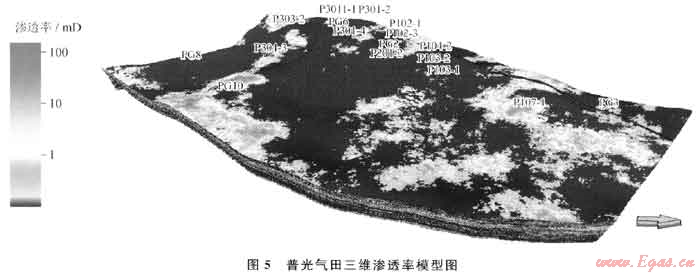 普光氣田儲(chǔ)集空間類型多樣,以孔隙為主,局部發(fā)育裂縫??紫抖群蜐B透率的關(guān)系受多種因素的控制,相關(guān)性不好。為此,在建立滲透率模型時(shí)分兩步進(jìn)行:①由于儲(chǔ)層孔隙類型不同導(dǎo)致孔隙度與滲透率關(guān)系多樣化,在計(jì)算滲透率模型時(shí),首先通過(guò)單井測(cè)井曲線聲波與密度的相對(duì)幅度差判斷孔隙結(jié)構(gòu)類型,按照不同孔隙結(jié)構(gòu)類型的孔滲關(guān)系式,由各井測(cè)井孔隙度計(jì)算出單井各層面不同孔隙類型的滲透率;②由于裂縫的存在,孔隙度變化不大,而滲透率卻成倍增大,因而在對(duì)滲透率模型計(jì)算時(shí)引入裂縫指數(shù)數(shù)據(jù)體對(duì)滲透率進(jìn)行裂縫校正。