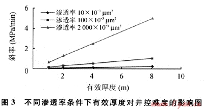 本方法以評(píng)價(jià)點(diǎn)與起始點(diǎn)間連線的斜率(pHmax/t)即最大關(guān)井井口壓力與恢復(fù)時(shí)間的比值來(lái)表征關(guān)井壓力恢復(fù)的快慢。那么分析滲透率和有效厚度變化下斜率的表現(xiàn)即可判斷不同滲透率或有效厚度情況下井控難度。