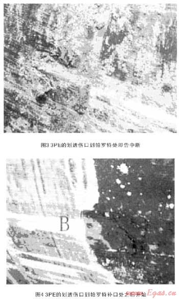 可以看到,管體3PE的劃透傷口到帕羅特補口處即告中斷,見圖3。也可看到,管體3PE的劃透傷口從帕羅特補口處之后開始,見圖4。