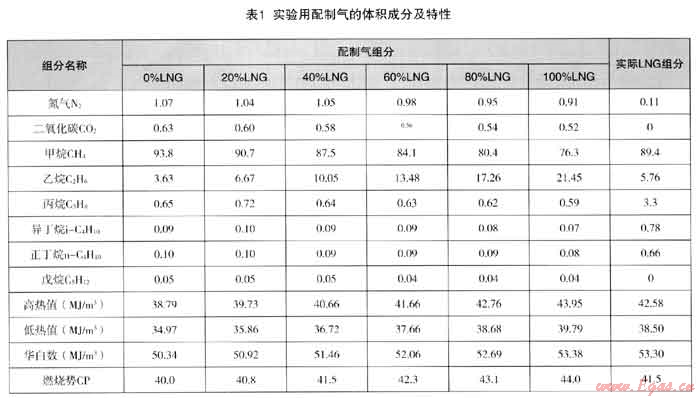 按照上述方案配制的LNG以不同比例(0、20%、40%、60%、80%、100%)與實(shí)驗(yàn)室管輸氣摻混即可模擬真實(shí)情況下用戶處的氣源組分。配氣裝置見圖1,配氣時采取西氣-乙烷-氮?dú)舛啻谓惶孢M(jìn)入的方式,盡可能保證均勻。監(jiān)測膜式燃?xì)獗硖幍娜細(xì)鉁囟龋员阌谶M(jìn)氣量的修正。配氣的目標(biāo)原則是華白數(shù)與目標(biāo)氣一致,燃燒勢盡可能接近。表1給出了實(shí)驗(yàn)室配制的測試用氣組分及特性,以LNG比例作為標(biāo)識。作為對比,同時給出了LNG的實(shí)際組分。