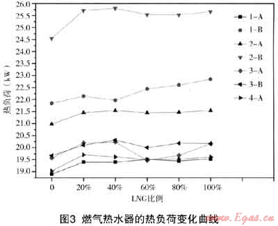 (1) 熱水器熱負(fù)荷增加,熱效率降低,CO排放增加,N0x無濕著變化;