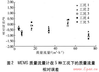 經(jīng)實(shí)驗(yàn)確定,前直管段長度最小應(yīng)為前直管段內(nèi)直徑(D)的5倍。在前直管段的前端連接不同的彎管(包括90°垂直或水平彎管及其各類組合),得到5種工況下的計(jì)量相對(duì)誤差,見圖2。5種工況分別為:工況1:1個(gè)90°垂直彎管+長5D的前直管段;工況2:2個(gè)90°垂直彎管+長5D的前直管段;工況3:2個(gè)90°水平彎管+長5D的前直管段;工況4:1個(gè)90°水平彎管+1個(gè)90°垂直彎管+長5D的前直管段;工況5:長15D的前直管段。由圖3可知,只要前直管段長度大于等于5D,各類彎管對(duì)MEMS質(zhì)量流量計(jì)的精度影響很小。