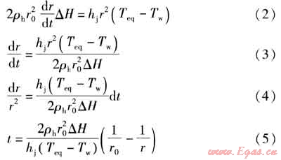 由以上分析可知,首先在液-液分界面處形成一個球形水合物膜層,水和客體物質(zhì)分別通過水合物膜層向兩側(cè)擴散以便相互接觸,促進水合物的生長。假設(shè)此時水合物向兩側(cè)的生長率相同,即rh=r0+dr,rb=r0-dr,當t=0時,r=r0,則由式(1)得到式(2)~(5)。