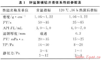 通過現(xiàn)場技術(shù)調(diào)研和室內(nèi)研究,形成了鉀鹽聚磺鉆井液體系的基本配方:0.3%~0.6%提黏提切劑G310-DQT+1%~2%抗溫降濾失劑G307-KWJ+3%~5%無機鹽抑制劑G312-WZJ+0.3%~0.6%有機抑制劑YZ-1+0.2%~0.3%NaOH+適量防腐劑+0.5%~2%潤滑劑G303-WYR?;九浞叫阅芤姳?。