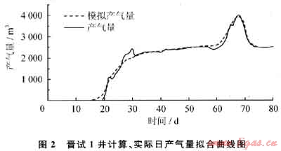 晉試1井巖心觀察及電鏡掃描結(jié)果顯示,鉆遇的煤層裂縫發(fā)育,分布不均勻,裂隙與層面斜交或平行展布。圖2是模型計算的晉試1井前80d的日產(chǎn)氣量與實際日產(chǎn)氣量的擬合曲線,計算過程中采用時間步長為1d,通過對初始參數(shù)進行調(diào)整,使模型模擬計算的日產(chǎn)氣量與實際日產(chǎn)氣量達到較好的擬合效果。由此表明,利用此模型進行考慮吸附變形的煤層氣分階段流動過程的驗證及對產(chǎn)量進行預(yù)測是可行的。