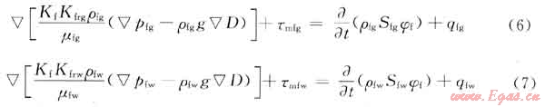 根據(jù)質(zhì)量守恒原理和達西定律推導(dǎo)出煤層裂隙系統(tǒng)中氣、水兩相的滲流微分方程分別為: