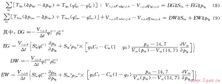 利用直角坐標(biāo)下的塊中心差分網(wǎng)格分別對基質(zhì)較大孔中氣、水連續(xù)性方程的等號右邊進行差分離散,在網(wǎng)格點(xi,yi,zk)上對煤層裂隙中氣、水滲流微分方程進行差分離散,獲得非線性方程組;然后采用IMPES方法對非線性差分離散方程組進行線性化,得到裂隙中氣 水兩相隱式壓力顯式飽和度差分線性方程組: