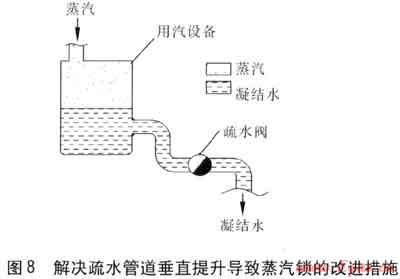 若疏水管道垂直提升,蒸汽則先進(jìn)入疏水閥,進(jìn)而發(fā)生蒸汽鎖[6],見(jiàn)圖7。解決這種蒸汽鎖的方法是改變疏水管道的結(jié)構(gòu),見(jiàn)圖8。使得凝結(jié)水可以依靠重力自然流動(dòng),不易發(fā)生蒸汽鎖。