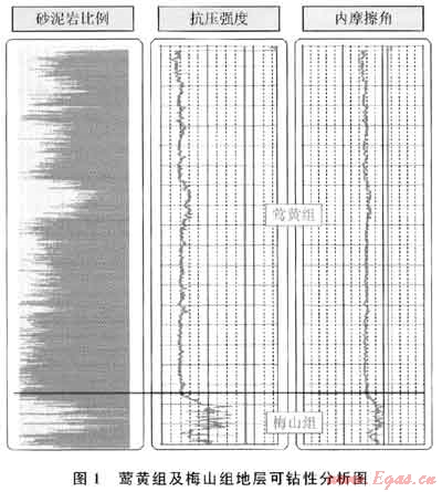 Φ311.15mm井段面臨著井段長、作業(yè)時間長、地層跨度大、下部層位石灰質(zhì)含量高、二次造斜等諸多挑戰(zhàn),鉆頭選型是否合理,關(guān)系到整口井的時效高低。本井段穿越鶯黃組下部、梅山組、三亞組(部分井缺失)地層,鶯黃組下部地層較為均質(zhì),地層抗壓強度介于34.5~55.2MPa,內(nèi)摩擦角在35°以下,具有較好的可鉆性;梅山組地層埋深大,地層抗壓強度介于55.2~103.4MPa,部分層位石灰質(zhì)含量高,內(nèi)摩擦角介于36°~40°,對鉆頭的抗沖擊性及抗研磨性具有較高的要求(圖1)。