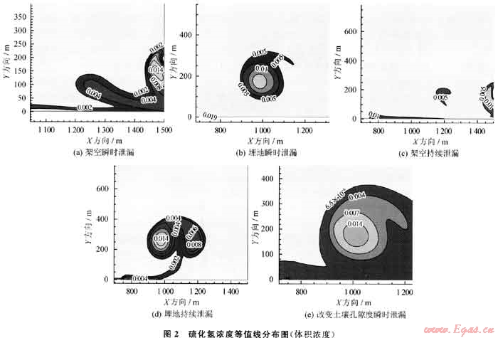 1) 氣體泄漏速度分布:X方向(水平方向)埋地管道泄漏(工況B、D、E)速度比架空管道(工況A、C)稍大,存在左偏的逆流區(qū);持續(xù)泄漏(工況C、D)速度等值線比架空瞬間右偏;埋地持續(xù)泄漏在左上和右下方存在2個速度較大區(qū);增大土壤孔隙度時,速度等值線左偏。Y方向(豎直方向)瞬間泄漏(工況A、B、E)速度在左側存在逆流區(qū);埋地管道泄漏0速度線向左偏移;土壤孔隙度增大時,等值線向左偏移;持續(xù)泄漏等值線呈近橢圓分布,不存在逆流區(qū)。